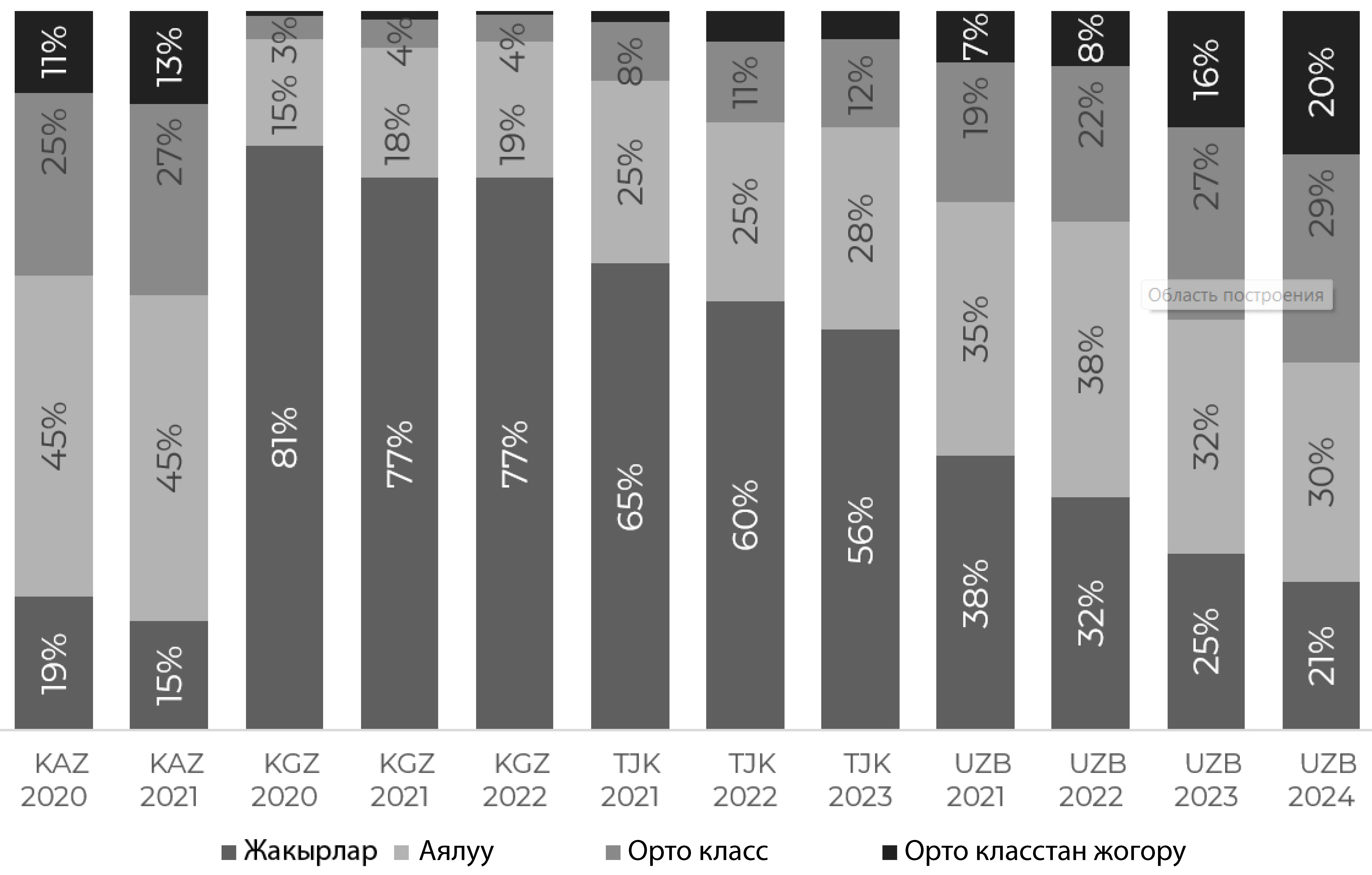 1-сүрөт. Борбордук Азия өлкөлөрүндө жашаган калктын курамында жакыр, аяр абалдагы, орто жана бакубат катмарларынын үлүшү
