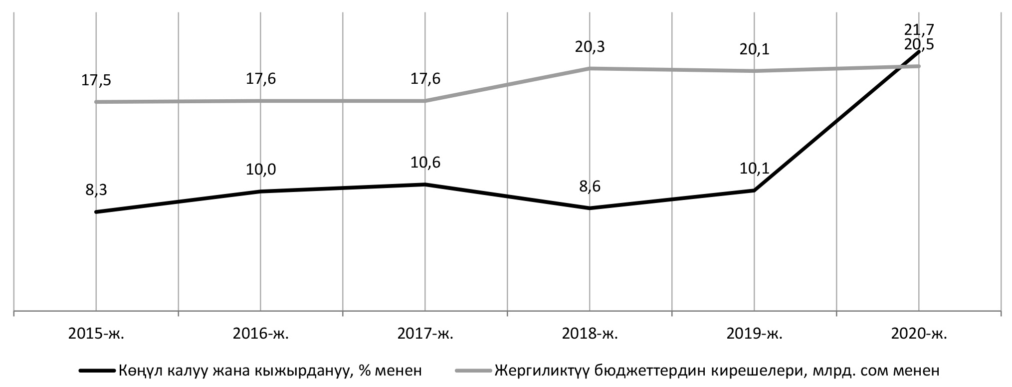 1-диаграмма. ЖӨБ органдарына терс эмоцияларды сезген жарандардын үлүшүнүн динамикасы жана жергиликтүү бюджеттердин кирешелеринин динамикасы, 2015-2020-жылдар.
