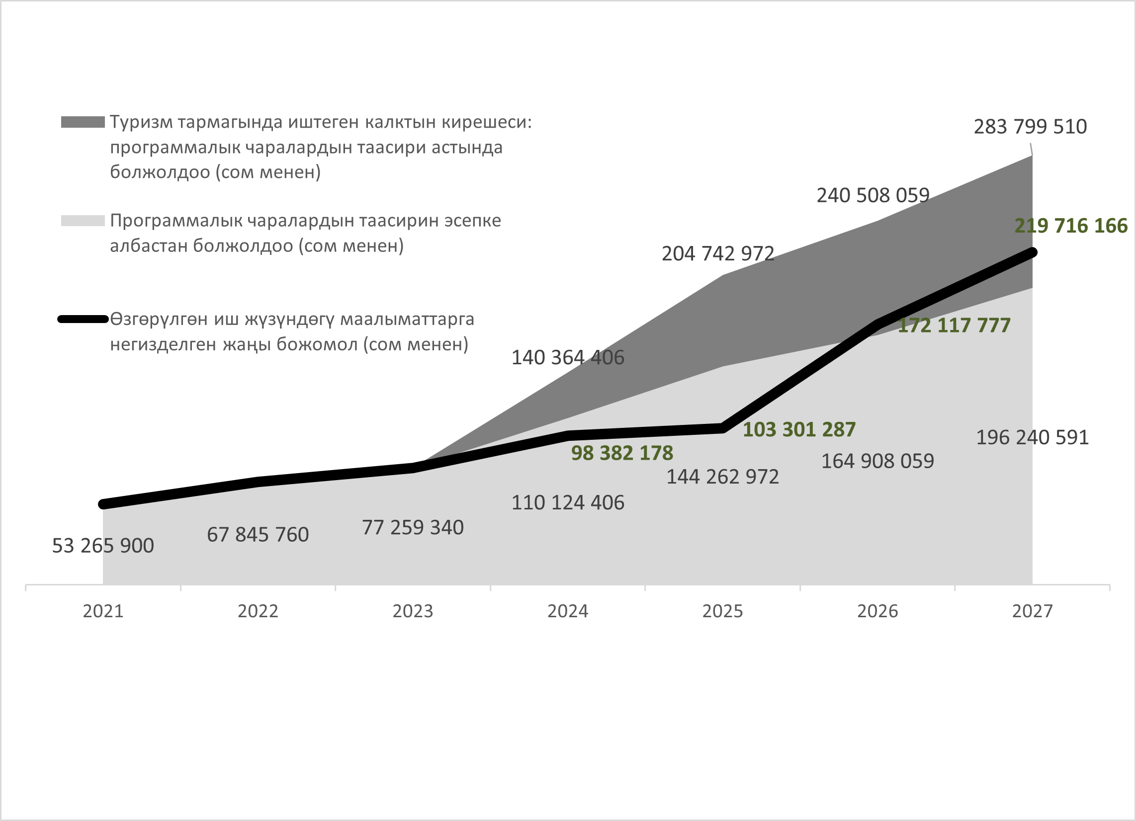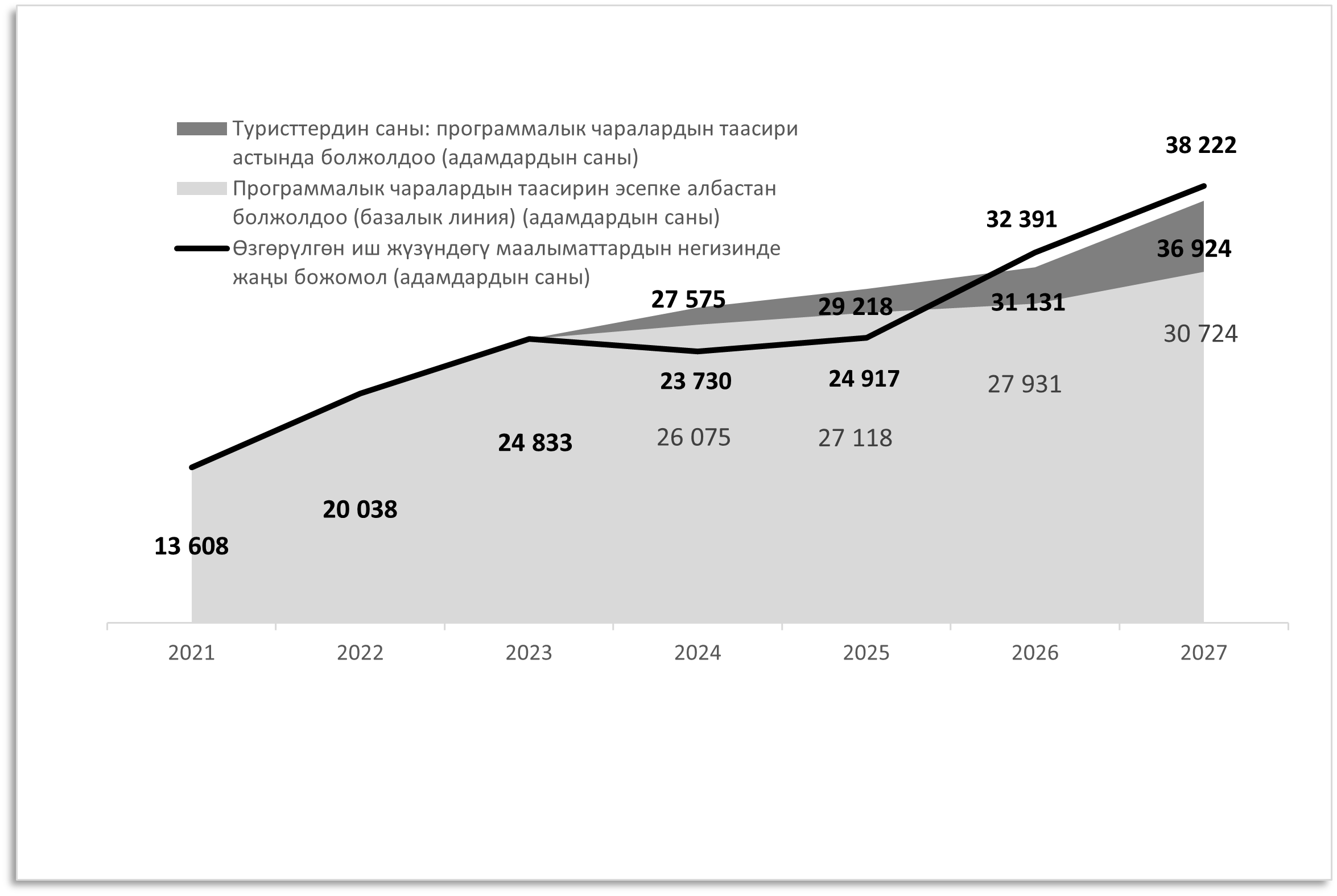 4-сүрөттө көрүнүп тургандай, 2024-жылы иш жүзүндөгү көрсөткүч форс-мажордук жагдайлардан улам болжолдонгон көрсөткүчтөн төмөн болуп чыкты: 2024-жылдын июнь айында селдин кесепетинен туристтер каза болушкан. Туристтер көп барган айрым жерлерде туристтердин саны азайды жана бул тенденциянын 2025-жылы да сакталып калмакчы, себеби талкаланган инфраструктура калыбына келтирилип, туристтердин бул жерлердин коопсуздугуна болгон ишеними кайрадан пайда болууга тийиш. Форс-мажордук жагдайларга карабастан, райондун СЭӨПсында белгиленген чаралар кырдаалды оңдоп, 2026-2027-жылдары буга чейинки серептин оптимисттик божомолунан да кыйла жогору жыйынтыктарды алууга жардам бермекчи. Мындай чараларга төмөнкүлөр кирет: