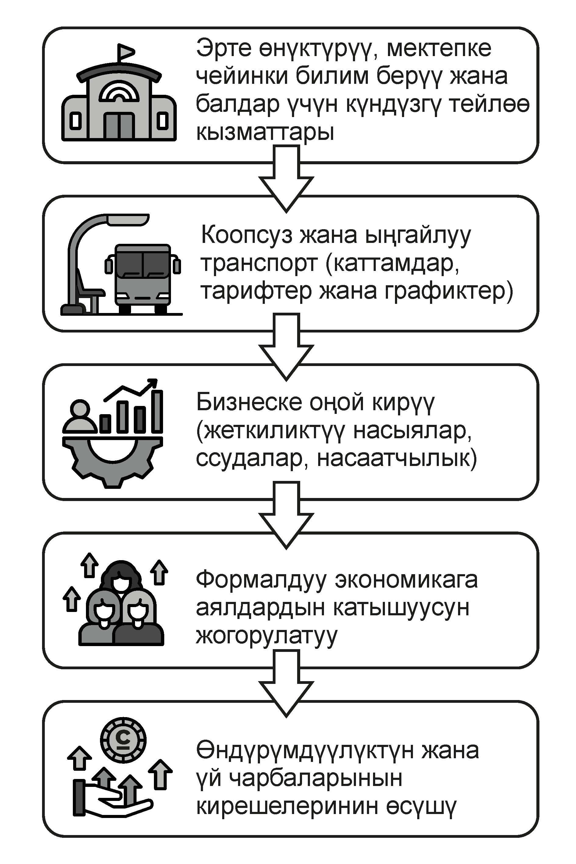 Жакырчылык менен күрөшүү жана экономикалык өсүштү тездетүү көз карашынан алып караганда аялдар Борбордук Азияда толук пайдаланылбаган чоң резерв бойдон кала берүүдө. Аялдарды өндүрүштүк экономикага интеграциялоо жана алардын экономикалык мобилдүүлүгүн жогорулатуу жакырчылыкты кыскартып, орто тапты кеңейтүүдө чечүүчү фактор боло алат. Бул жерде Өзбекстандын тажрыйбасы кызыктуу: мында мамлекет үй-бүлөлүк бизнеске, устаттыкка же устачылыкка жигердүү колдоо көрсөтүп, ошондой эле аялдардын билим алуусу үчүн пайызсыз насыя берүүдө, мунун натыйжасында ЖОЖдордогу орундардын 52 пайызын кыздар ээлейт. Ал эми жалпысынан Өзбекстандын өкмөтү аялдарды колдоого жыл сайын 1,5 миллиард долларга жакын каражат бөлүп турат. Бул жерде күчтүү рычаг иштейт – эрте курактагы балдар үчүн инфраструктура бар, себеби мектепке чейинки билим берүү мекемелеринин масштабы кеңейген жерде аялдардын формалдуу экономикага кайтуусу үчүн тоскоолдуктар да азаят жана бул кирешенин өсүү траекториясында ошол замат чагылдырылат. Өзбекстан Республикасынын ишке орноштуруу жана жакырчылыкты кыскартуу министринин биринчи орун басары Марат ЖУРАЕВдин баамында, дал ушул нерсе Өзбекстандагы мектепке чейинки программалар менен камтуудагы таасирдүү секирикти түшүндүрөт. Ошону менен бирге расмий баалоо боюнча, бул динамиканын толкунунда миллиондон ашык аял билим алууга кайтып, кесипти өздөштүрүп, акча таба башташты. Башкача айтканда, бала бакчага болгон “социалдык” суроо-талапты эмгектин экономикалык сунушуна айландырууга мүмкүнчүлүк болду. Өндүрүмдүүлүктүн логикасына таяна турган болсок, аялдардын жумушка орношуусу – бул адилеттүүлүк маселеси гана эмес, бул ошону менен бирге “өсүш инженериясы”: Борбордук Азияда жогорку өндүрүмдүүлүктөгү жумуш орундары жетишсиз жана ошол эле учурда жумушчу күчүнүн катышуу көрсөткүчү төмөн, айрыкча аялдар арасында. Ушундан улам формалдуу эмес же “нөлдүк” жумуштуулуктан формалдуу жумушка өткөн ар бир кошумча аял кош эффект берет – салык базасын кеңейтет жана жергиликтүү компаниялардын үлүшүн көбөйтөт, себеби бул компанияларда кадрларды тандап алуу мүмкүнчүлүгү кеңири болот. Ошондуктан, реформалардын программаларында декларациялар эмес, операциялык түйүндөр маанилүү – коопсуз транспорт жана ийкемдүү жумуштуулуктан баштап, өз алдынча иш менен камсыз кылууга жана негизги кредиттөөгө жөнөкөй жол менен жетүүгө чейин, себеби дал ушулар “гендердик күн тартибин” дүң регионалдык продуктунун өсүшүнө айландырышат (Габриэра ИНЧАУСТЕ, Дүйнөлүк банк).