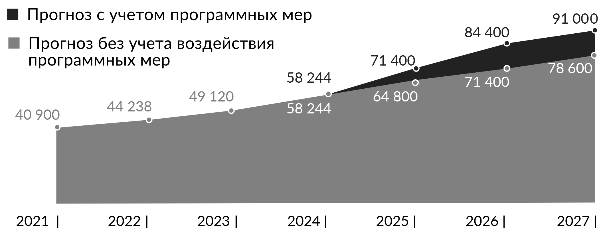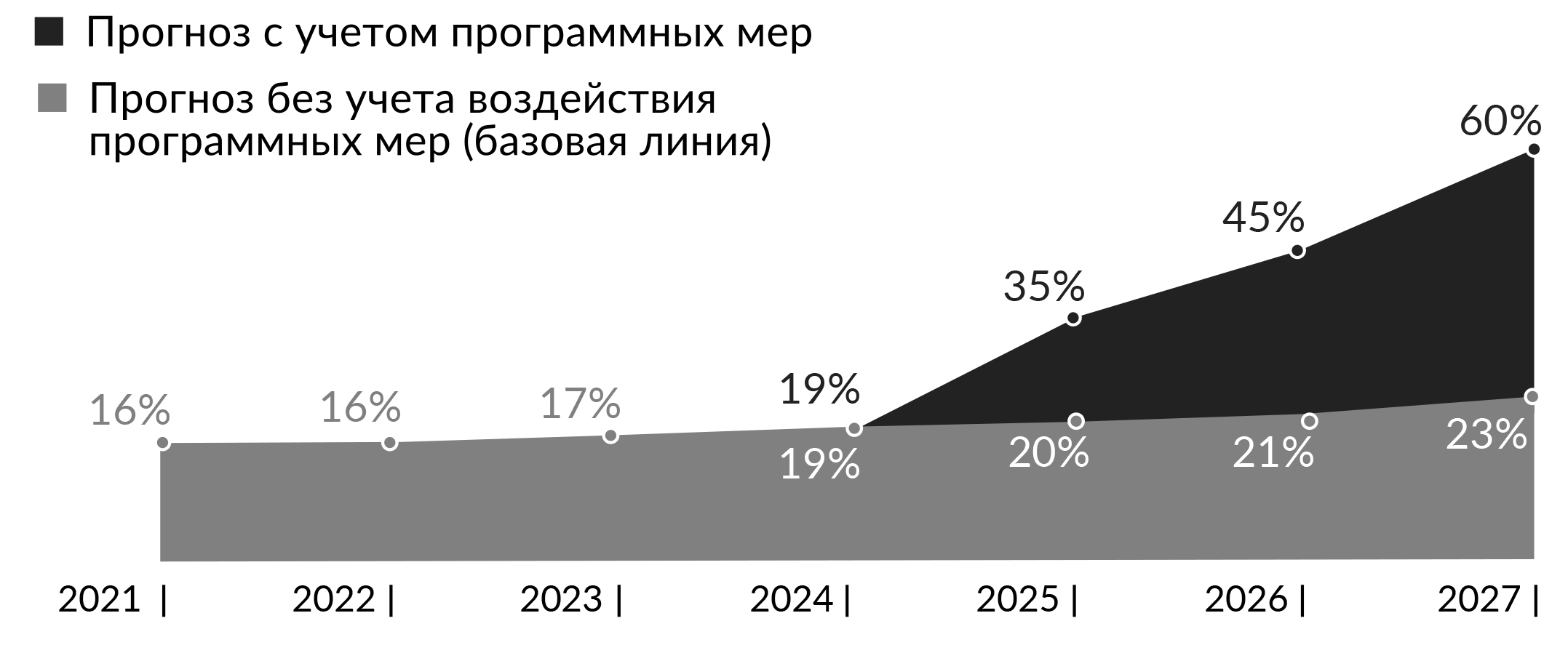 Благодаря этому в ближайшие три года охват населения вывозом ТБО должен значительно увеличиться: с 23% по базовому прогнозу в 2027 г. до 60% в том же 2027 г. (см. рисунок 4).
